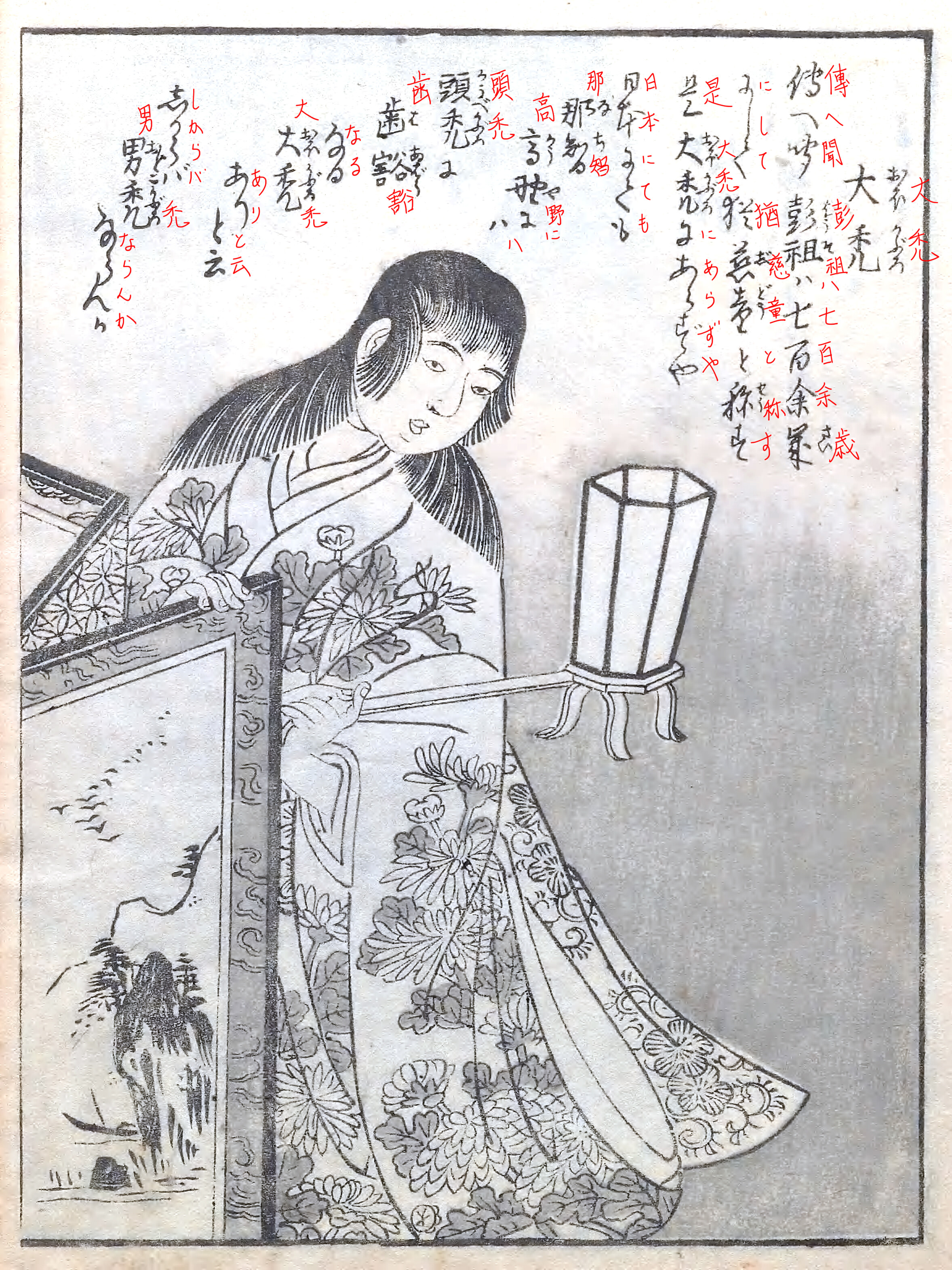 挿絵の大禿の着物の模様は菊で、本文にも出てきた菊慈童を表しています。