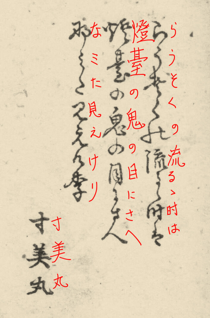 蝋燭《らうそく》の 流るゝ時は 燈臺の 鬼の目にさへ 涙見えけり 寸美丸《すみまる》