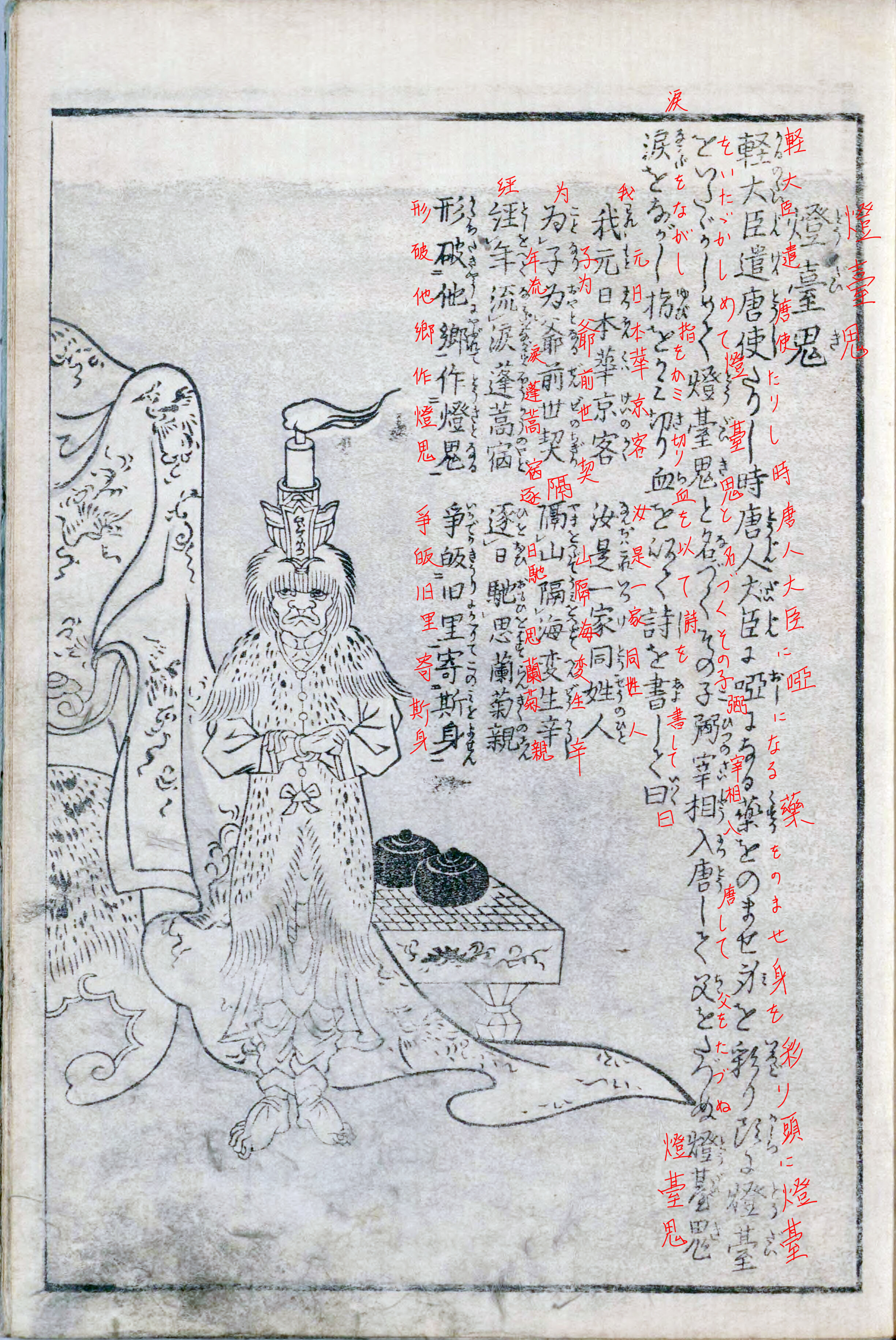 軽大臣《かるのだいじん》、遣唐使《けんとうし》たりし時、唐人《とうじん》、大臣《だいじん》に啞《おし》になる藥《くすり》を飲ませ、身《ミ》を彩《いろど》り、頭《かしら》に燈臺《とうだい》を戴《いたゞ》かしめて、燈臺鬼《とうだいき》と名付く。