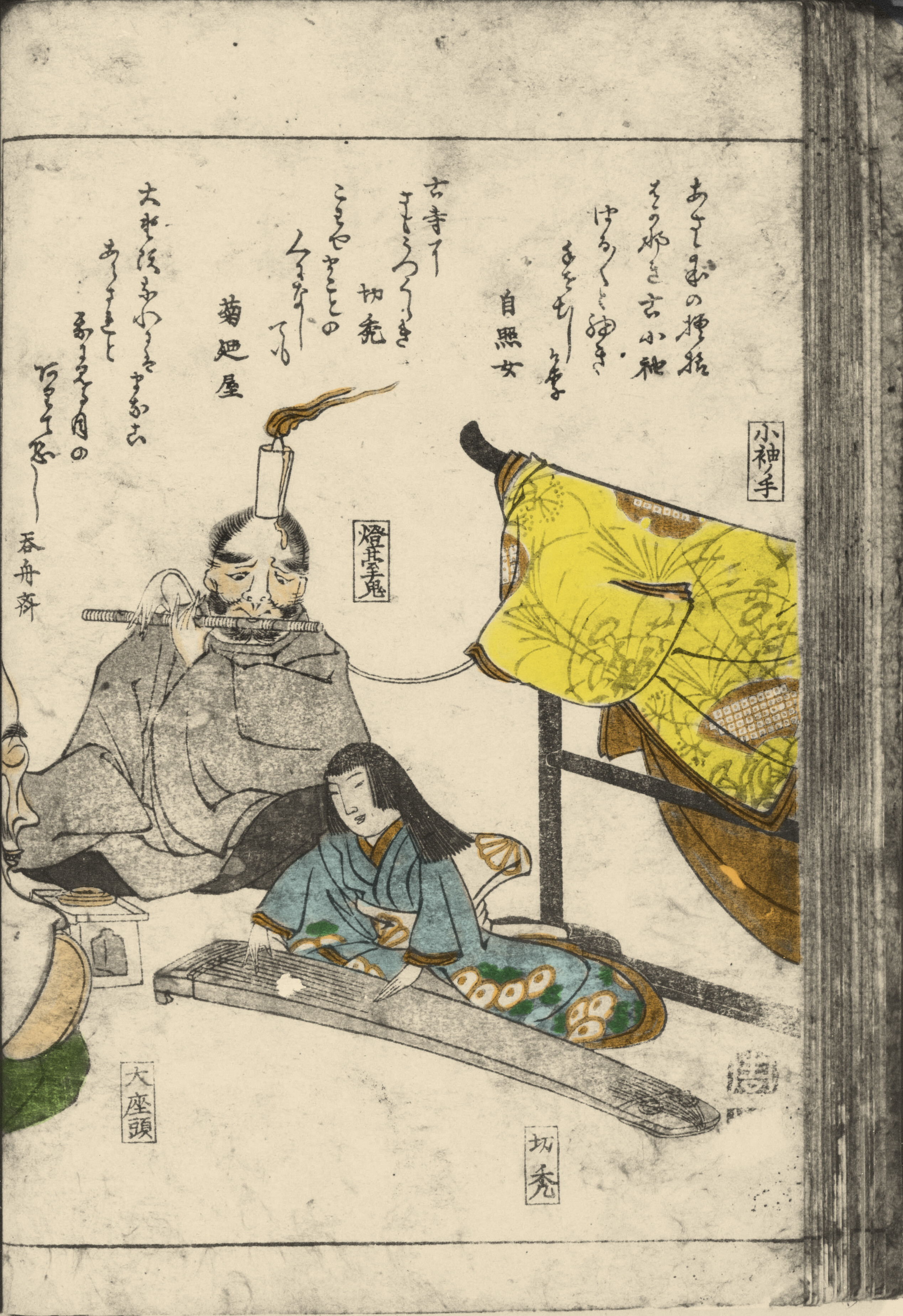 ① 笛を吹く灯台鬼を小袖の手が補助し、切禿《きりかぶろ》は琴、大座頭は琵琶を弾き、狸は腹鼓を叩き、小間使いの酒買小僧が控えています。