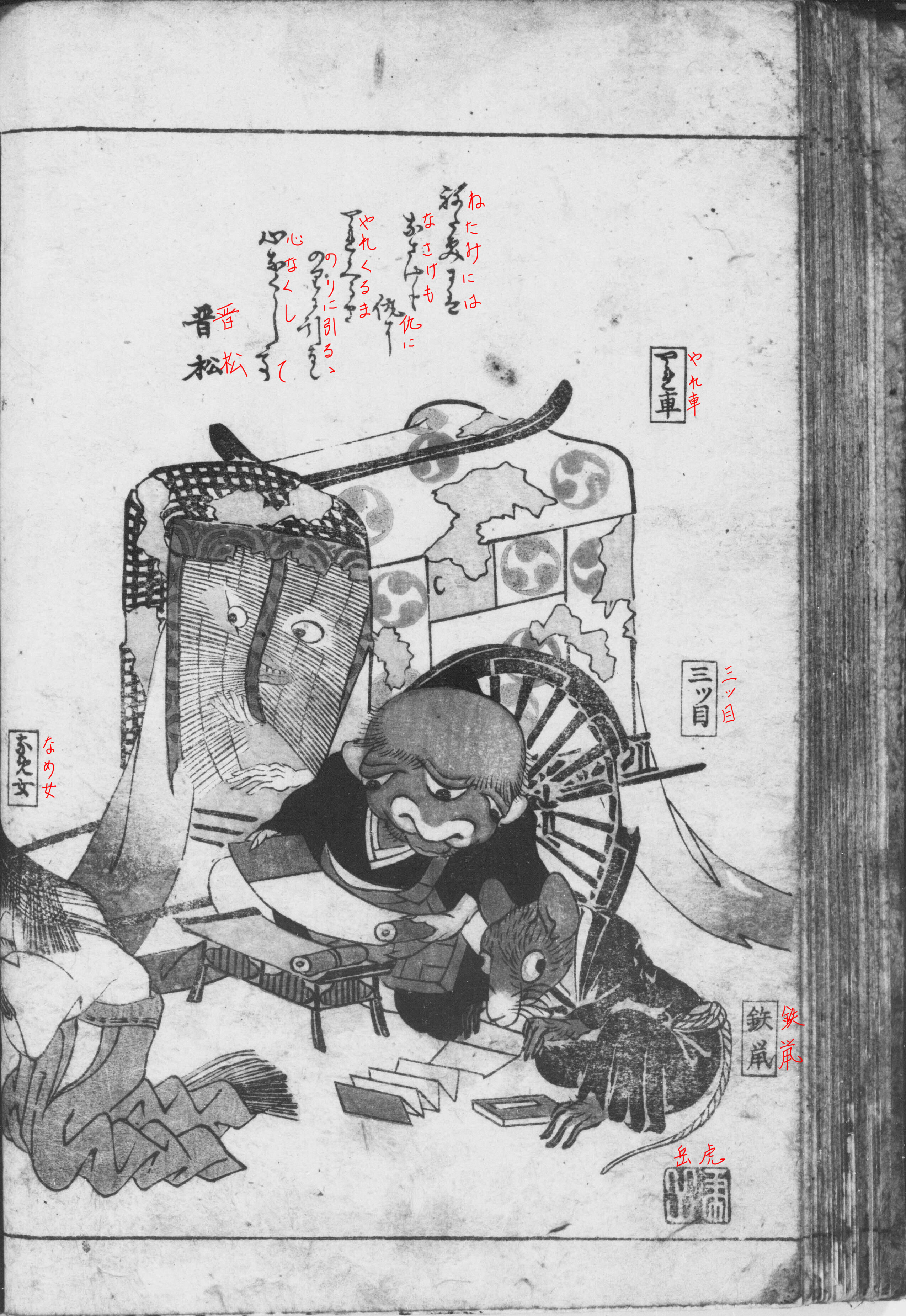 ② 宮中に仕える蔵人姿の一つ眼と、官女姿の舐め女が、破《や》れ車を引き、巻物を広げる坊主姿の三つ目の前で、鉄鼠《てっそ》が経文をかじっています。