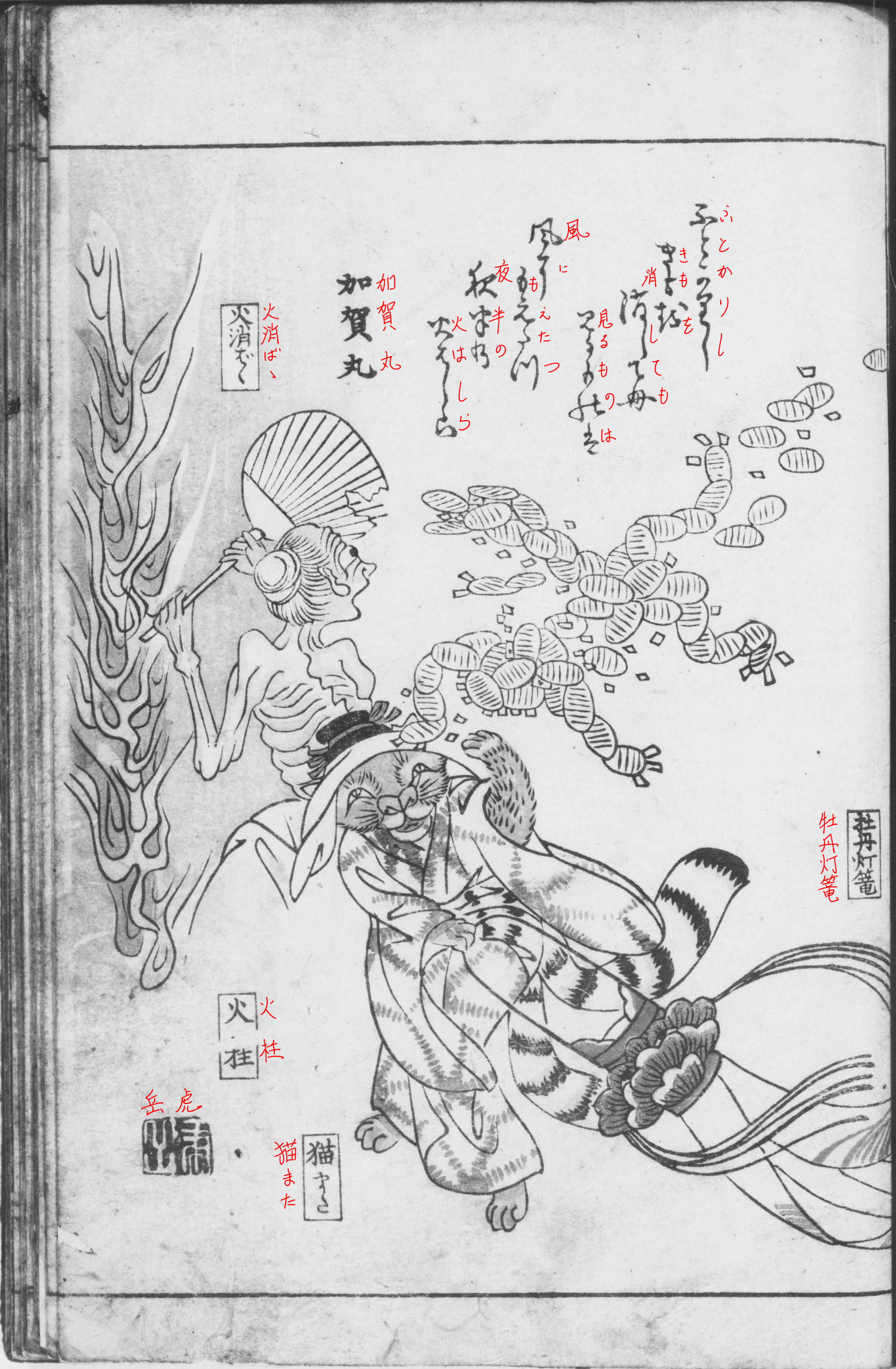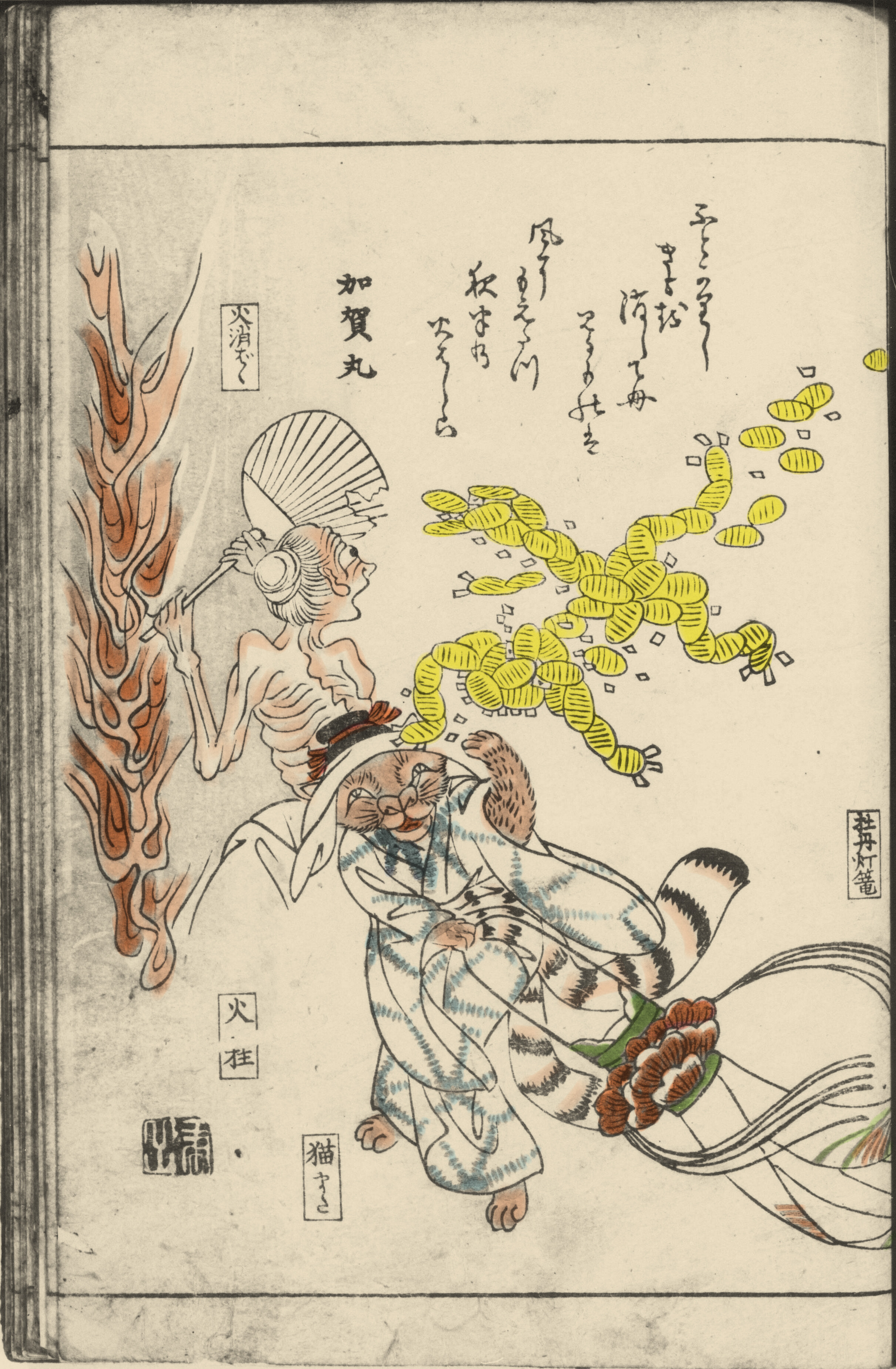 ④ 火柱を消そうとしている火消し婆と、牡丹灯籠を持つ美女に化けた猫又が、飛んでくる人型の金の精に驚いています。