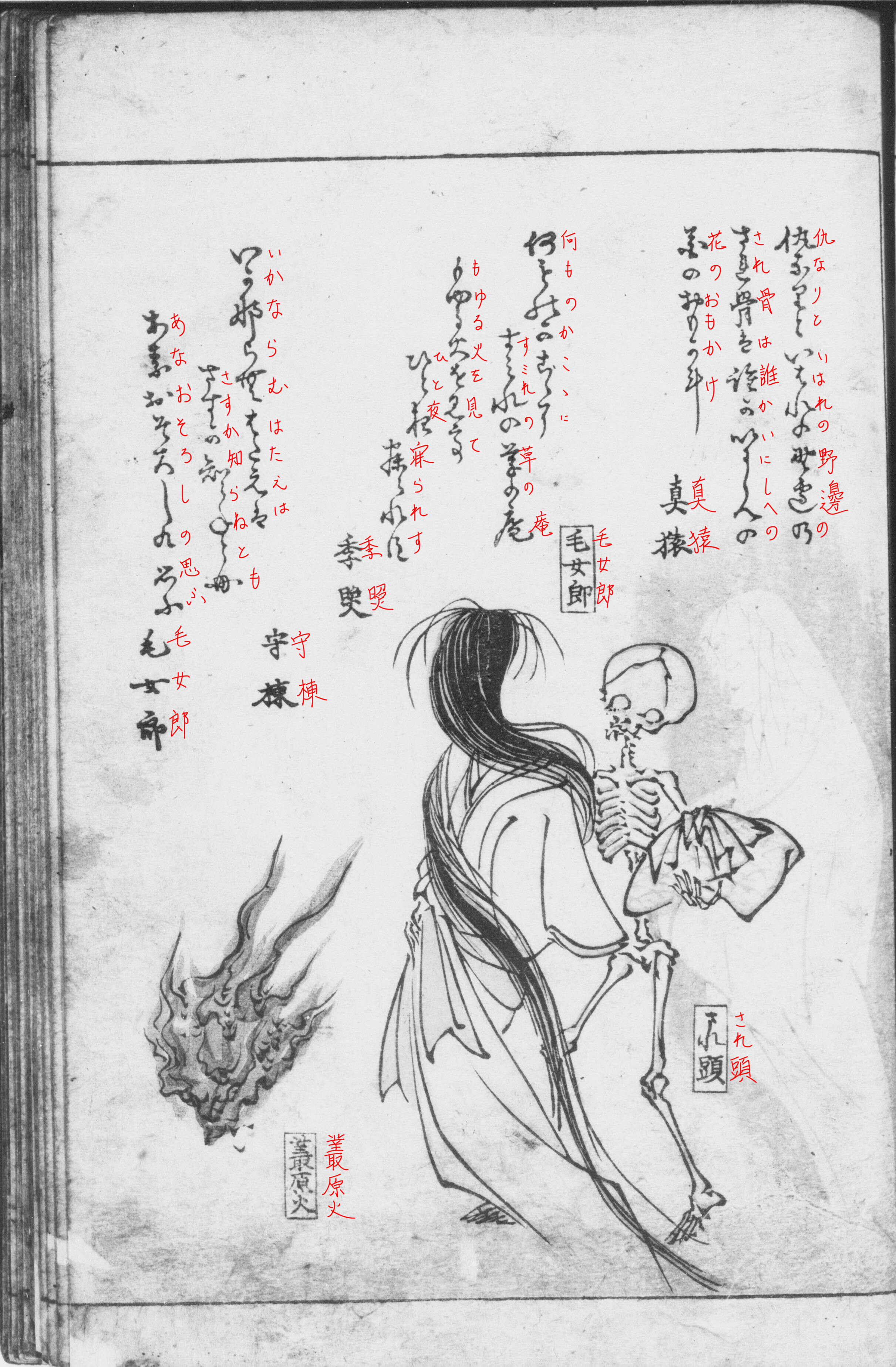 ③ 叢原火《そうげんび》の先導で、遊女姿の毛女郎と雪女、そして下男の曝れ頭《されかうべ》が続き、それを遊客姿の天狗と下男の狐火がウヒョーと見つめています。