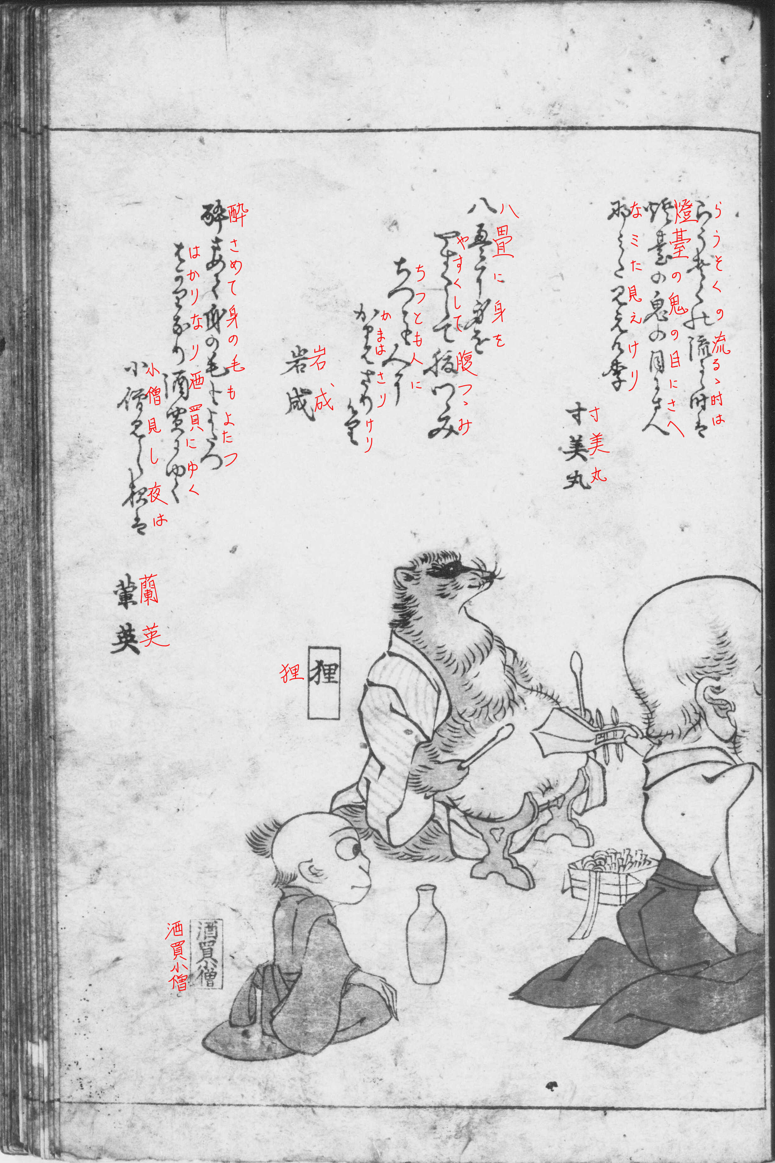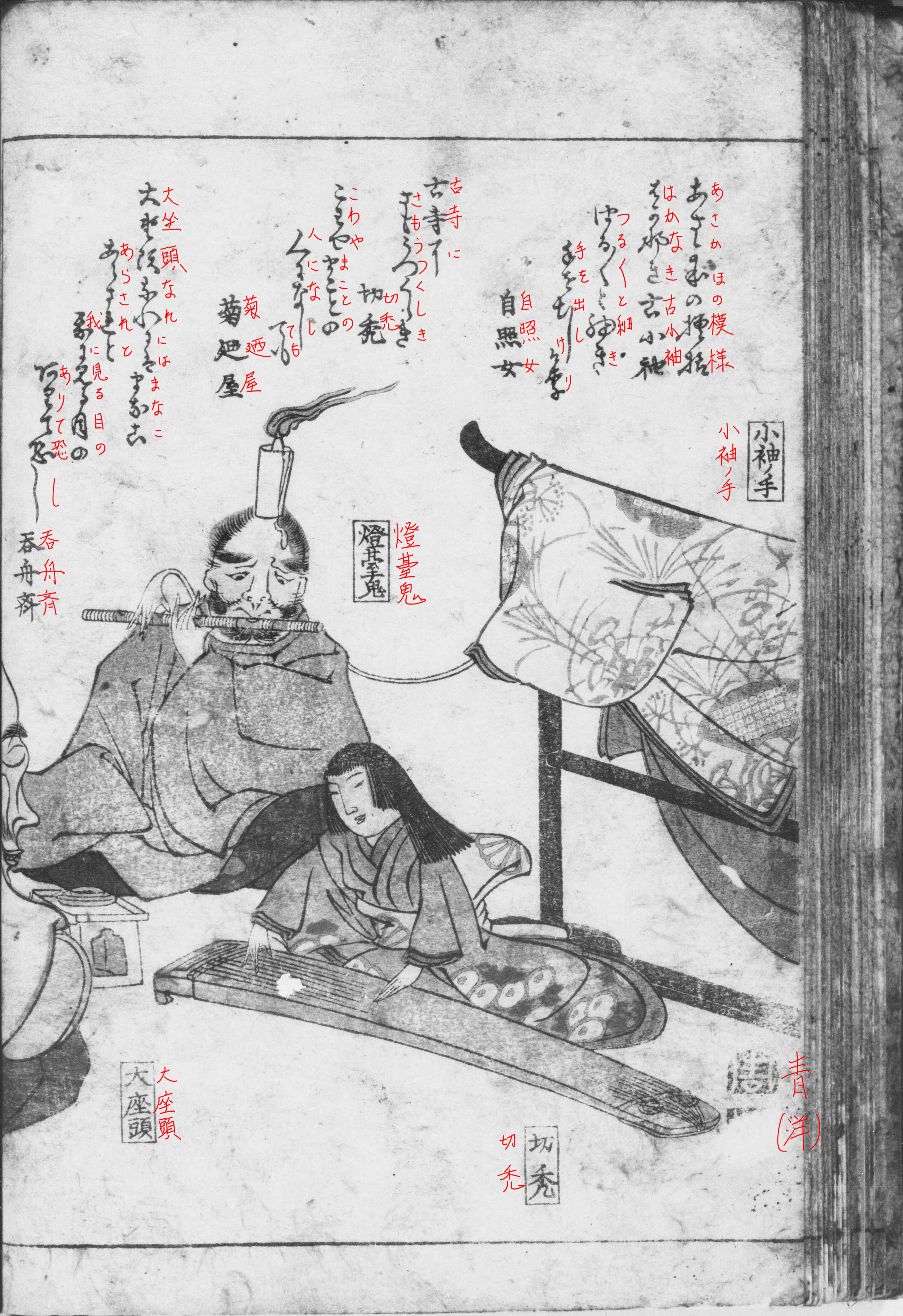 ※以下、赤字の書入れは筆者。① 笛を吹く灯台鬼を小袖の手が補助し、切禿《きりかぶろ》は琴、大座頭は琵琶を弾き、狸は腹鼓を叩き、小間使いの酒買小僧が控えています。