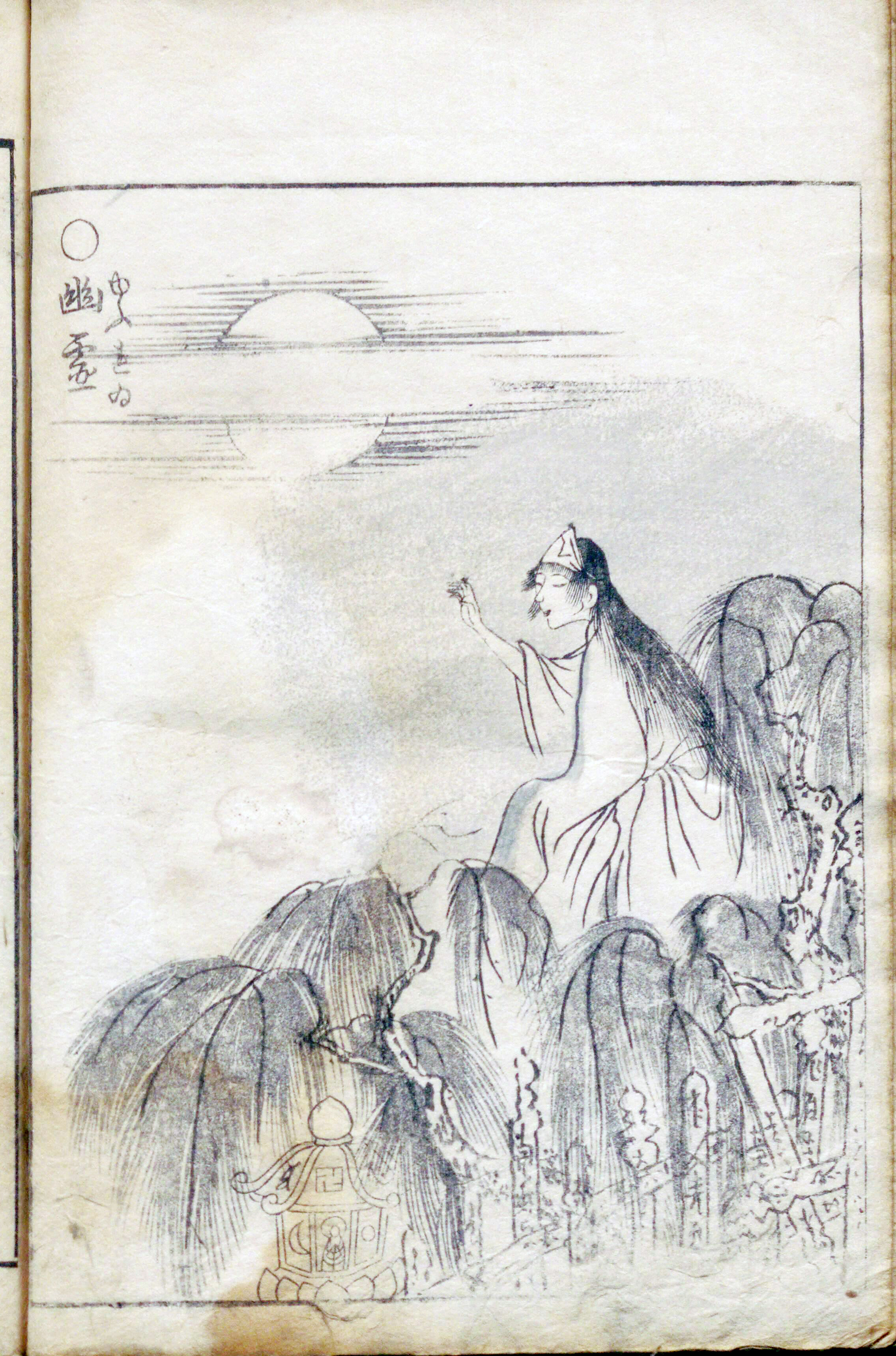 【解説】 産女《うぶめ》は、亡くなった妊婦の妖怪で、江戸時代には多く描かれているメジャーな妖怪です。 石燕の産女はおそらく『百怪図巻』の産女がベースになっていると思われます。