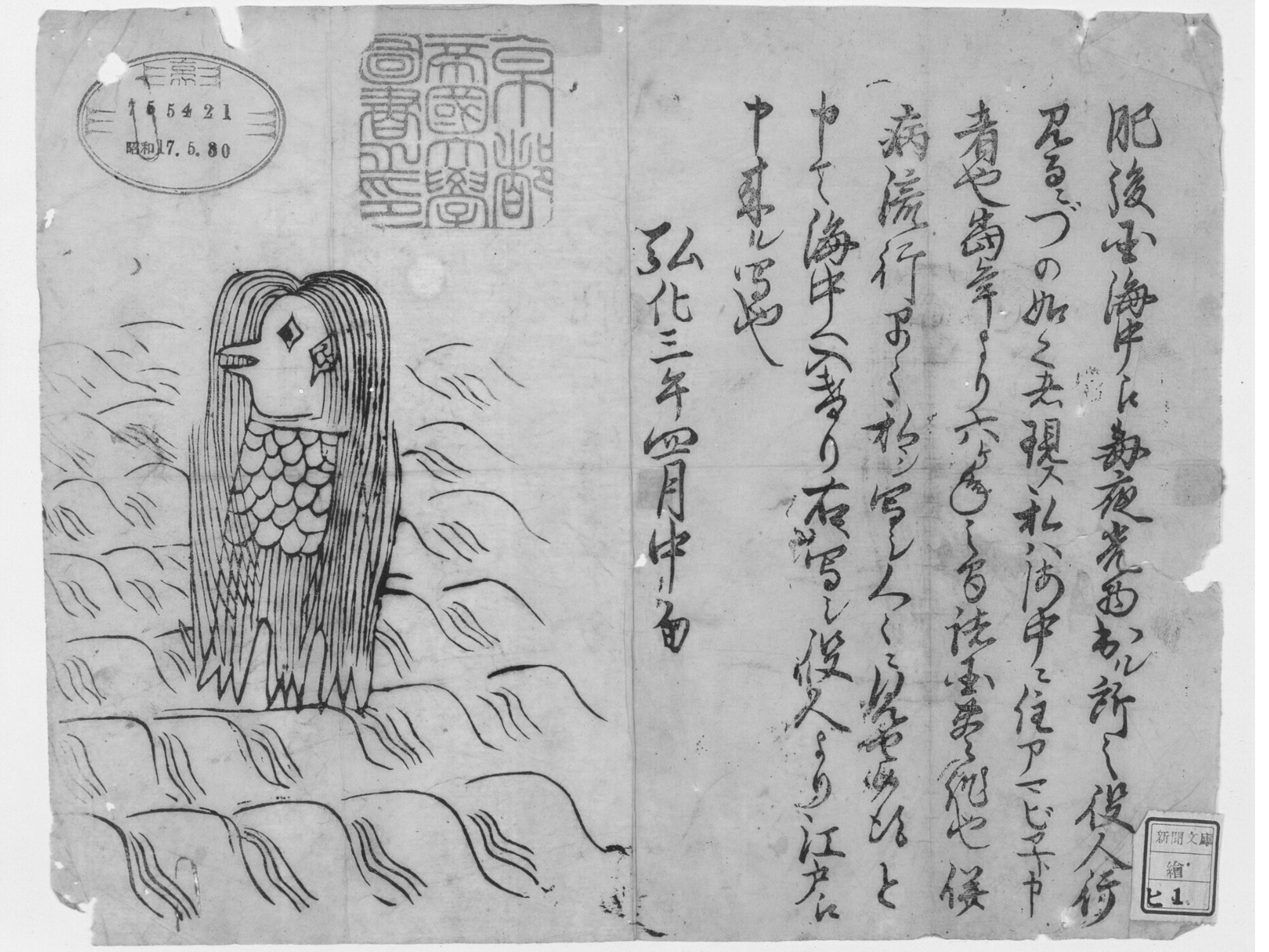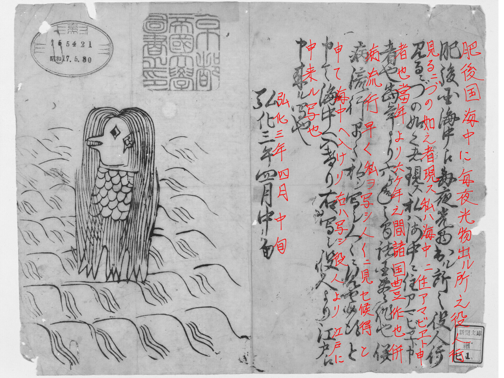 この絵はそのアマビヱの姿を描いたもので、肥後の役人から江戸への報告のために描かれた絵です。