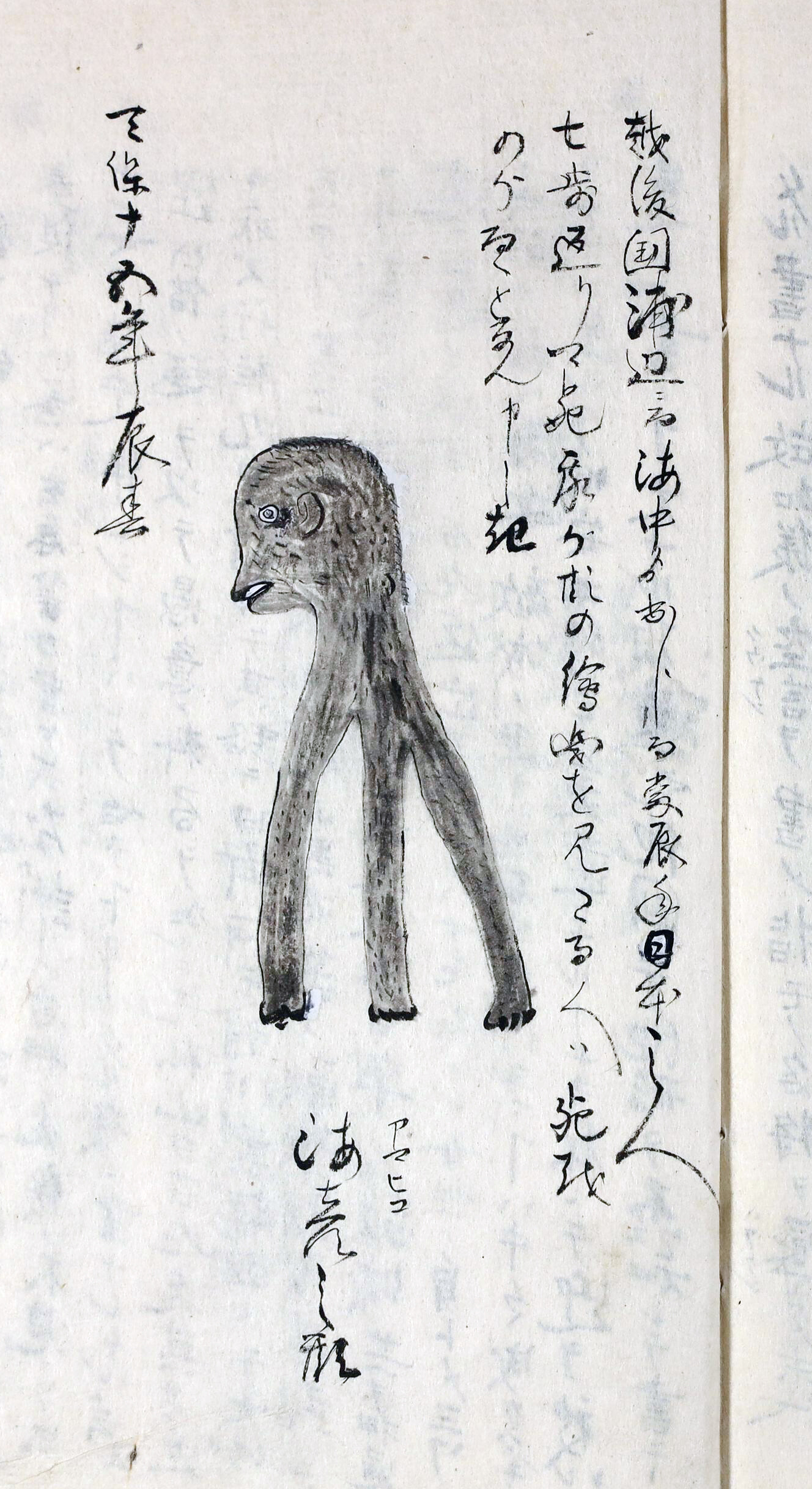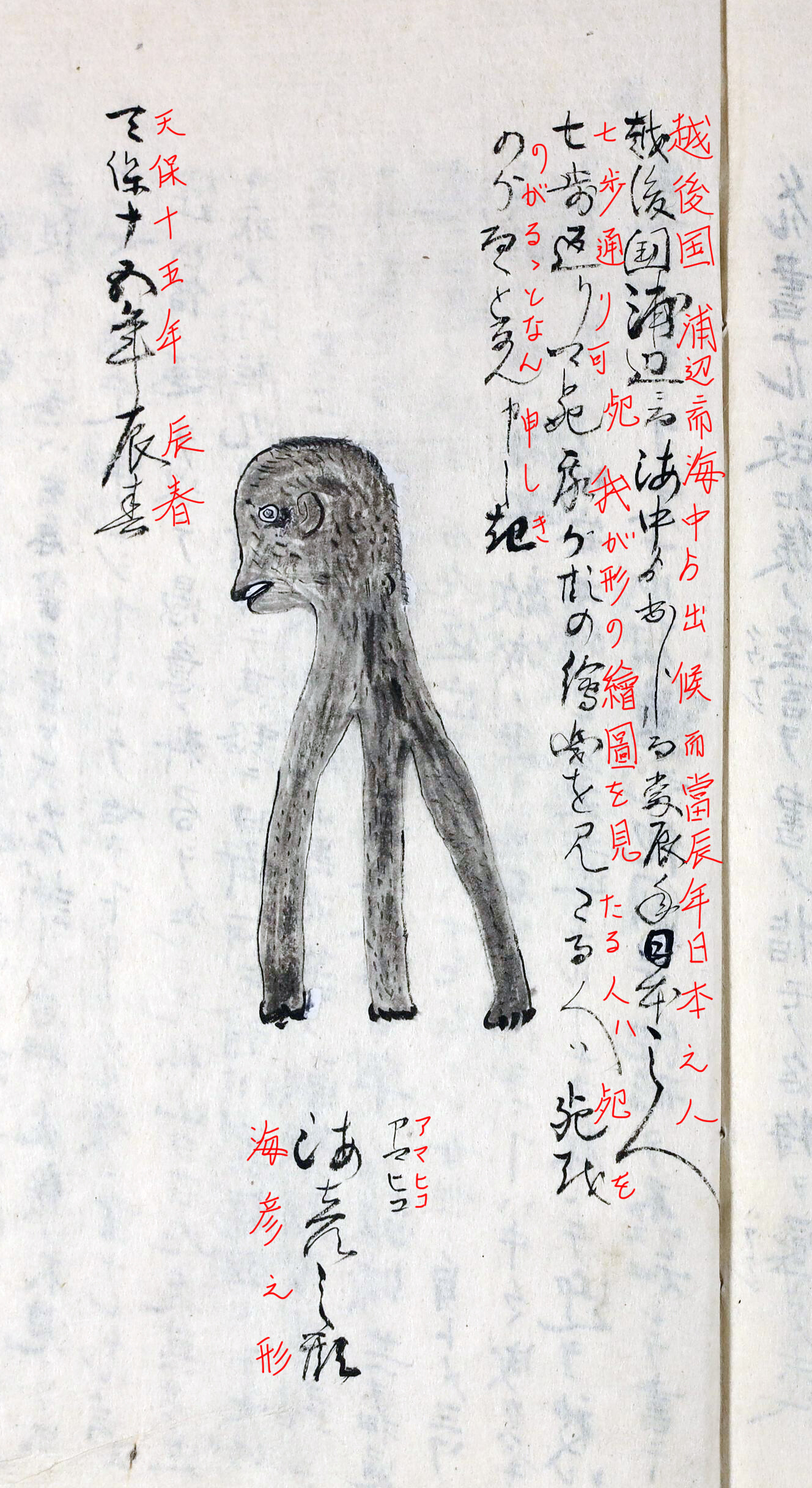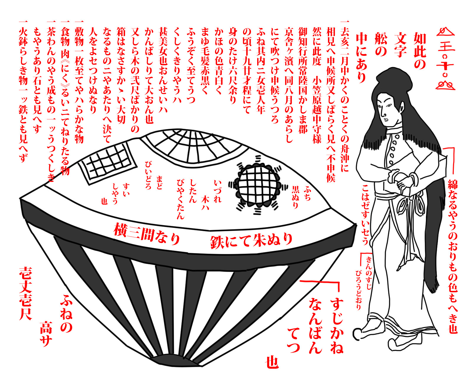 虚舟《うつろぶね》、其の内ニ、女壱人、年の頃十九 廿《にじふ》才程にて、身の丈《たけ》六尺余り、顔の色青白く、眉毛髪赤黒く、風俗至つて美しく、器量《きりやう》ハ甚《はなは》だ美女也。