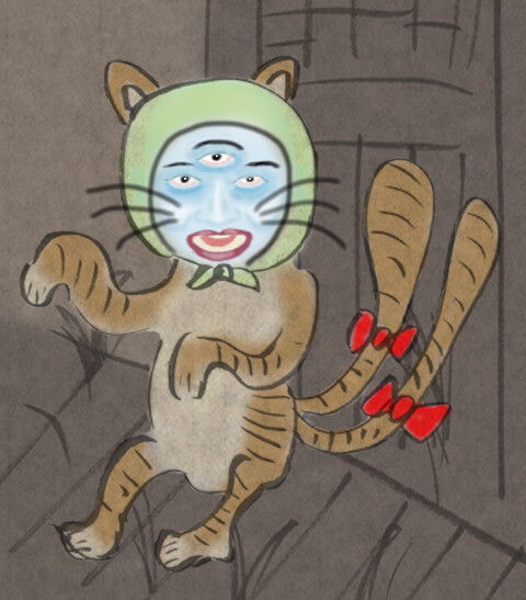 【解説】 挿絵は、本来なら、牡丹の灯籠を持った美女、または美女の正体のガイコツ幽霊が描かれるはずですが、描かれているのは牡丹の灯籠だけで、パロディー化されて、美女の代わりに美女に化けた猫又が描かれていますヾ(๑╹◡╹)ノ"